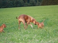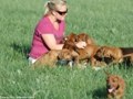 Dank der Impfung ist nun nicht mehr an der IGUGU-Grundstücksgrenze Schluss mit der Erkundungstour - ab jetzt darf die große Welt erkundet werden! Also haben wir seitdem täglich einen Ausflug gemacht - alle 13 Kleinen plus 2 Große plus 2 oder manchmal auch mehr Zweibeiner ab ins Auto und dann los ins Grüne, welch eine Gaudi :-) Autofahren ist seitdem sehr beliebt, denn es gibt dabei die feinsten Leckereien und am Ende der Fahrt wartet jedes Mal eine neue riiieeesige Wiese mit den unterschiedlichsten Gerüchen! Die Ausflüge haben alle so richtig genossen, so so sooooo schön war das Bild, wie 15 glückliche RRs zusammen ausgelassen über die Wiese tollen.... keiner hatte Angst vor Neuem, alle haben mutig die Gegend erkundet - und das ohne den Anschluss an die Gruppe zu verlieren - sie sind uns freudig und gut gelaunt gefolgt und die riesige Meute konnte durch vier Züchterhände locker gehandelt werden ;-) Auf KEINEN Fall lag das nur an der gekochten Leber, die wir mitgenommen haben, die liiiieeeeben uns halt *lach* ;-)))))