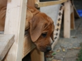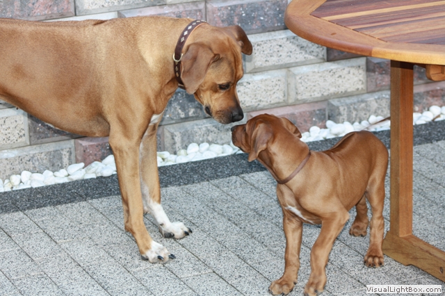 Besuch kam in dieser Woche auch wieder jede Menge, alle wollten die kleinen Schätze noch einmal besuchen, bevor sie in die große weite Welt hinausziehen... Hundebesuch kam auch noch, und zwar in Form von Kani, Dayo und Lesloh (mit Tina und Christian)... die beiden RRs wurden natürlich direkt als Familie erkannt und somit zwar begeistert bespielt aber für ziemlich normal befunden... und dann kam LESLOH - Oh My GOD es gibt ja Tiere die nicht aussehen wie ein Ridgeback ;-)))) Lesloh ist ein blonder Labrador, na den mussten sich aber alle erst mal aus der Nähe ansehen, was für eine Aufregung ;-)