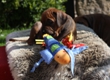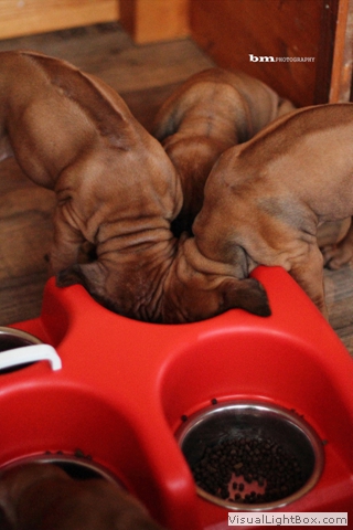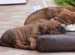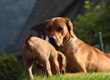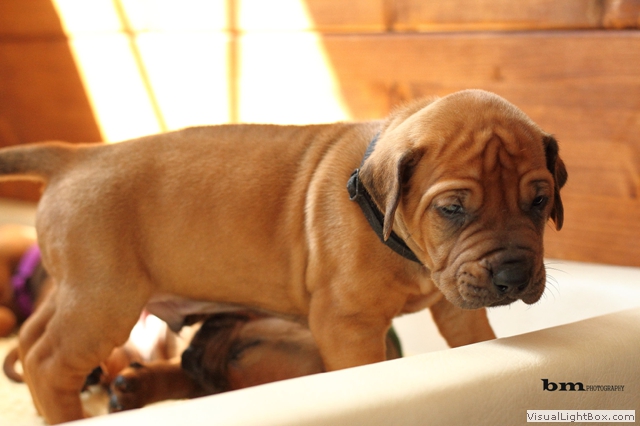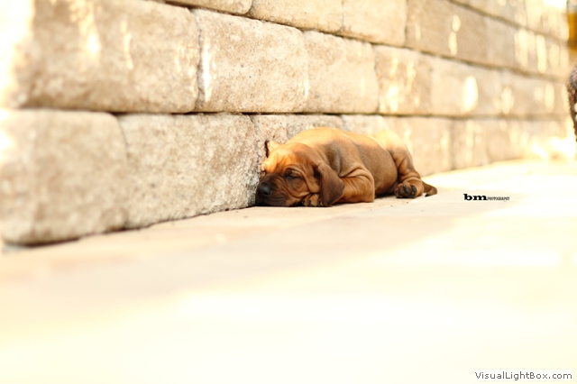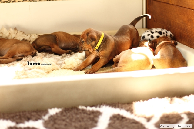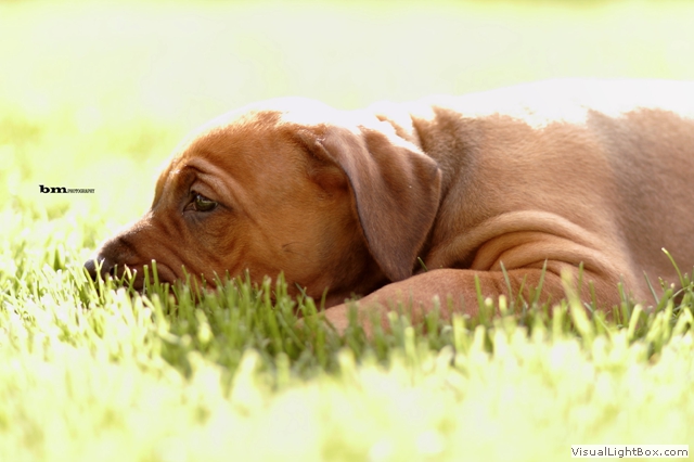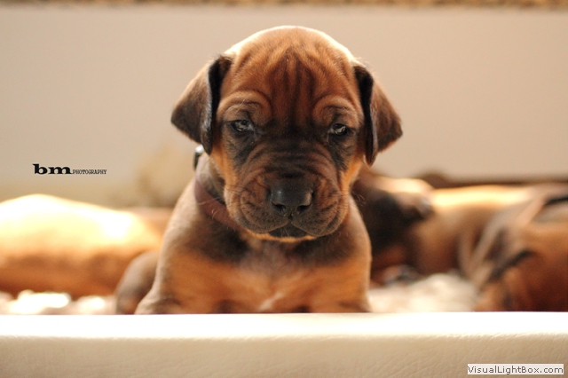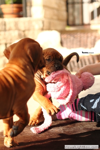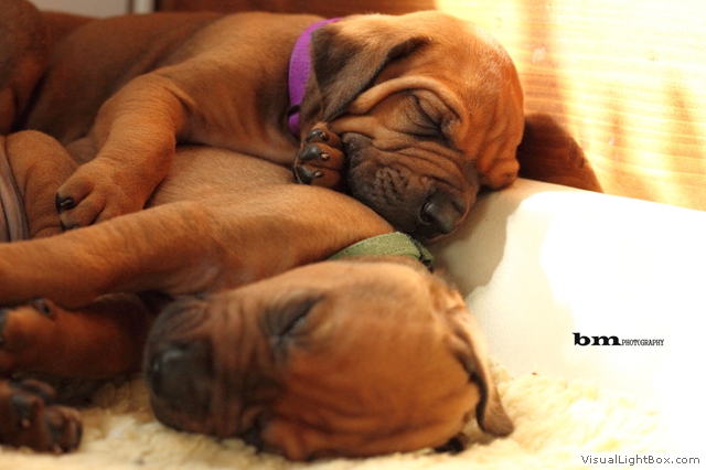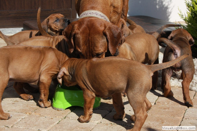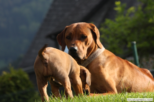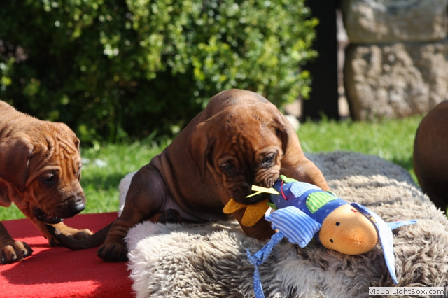 Halleluja, das Aprilwetter musste endlich dem lang ersehnten wunderschönen, ridgebackfreundlichen Afrikawetter weichen -zumindest für ein paar Tage ;-) aber wir wollen ja mal das beste hoffen und zum Glück haben die Miniridgebacks ja ihr eigenes Partyzelt im Garten und so bleiben Spielsachen und Co. trocken, komme was wolle :-) In den letzten Tagen konnten wir uns aber wettermäßig alles andere als beschweren und die MiniIGUGUS (die gar nicht mehr mini sind, man kann ihnen beim Wachsen förmlich zusehen) konnten endlich in vollen Zügen den Garten mitsamt Abenteuerspielplatz genießen! Welch eine Gaudi, es wird getobt was das Zeug hält und unsere Minis erkunden mutig jede neue Ecke... springen voll Karacho ins Bällebad, jagen durch die großen Tunnel und streiten sich lautstark um die beliebtesten Liegeplätze - wie immer, unter der Sonnenliege im Schatten, da wird schon eifrig diskutiert, wer da drunter der Boss ist *lach*. Im Outdoortrainingsparcours werden die tapferen Löwenjäger fleißig auf die unterschiedlichsten Dinge geprägt und ständig kommen neue hinzu...den Ideen sind keine Grenzen gesetzt und meistens sind es die einfachen Dinge, die sich als der absolute Welpenspaß entpuppen: Jutesack, Flatterband, Autoreifen, , Klapperdosen und Bällebad sind gleichermaßen beliebt bei den kleinen IGUGUentdeckern und spielerisch wird alles, was neu ist, sofort mutig erkundet. Gechilled wird natürlich auch jede Menge, es gibt soooo viel Neues zu entdecken und das schlaucht natürlich ;-) und weil es endlich warm genug ist, auch mal ein Schläfchen im Schatten unterm Kirschbaum zu halten, gibt es jetzt auch im Garten viele kuschelige Chill-out-Areas :-) da machen dann die drei Großen Damen auch gerne mit :-D Zwischen dem ganzen Streß (Abenteuer erleben-schlafen-Abenteuer erleben-schlafen...) wird vom zweibeinigen Personal natürlich auch die eine oder andere Leckerei gereicht. Auch da sind die Löwenjäger offen für Neues und neben Tartar, Babybrei und Mummymilkbar haben sie auch schon Körnerkäse-Honig-Ziegenmilch-Gemisch, Fleisch und Reis probiert und für ausgesprochen lecker befunden. Trockenfutter mögen sie auch schon ziemlich gerne - die nigelnagelneuen Zähnchen wollen endlich zum Einsatz kommen und deshalb haben alle viel Spaß daran, das Welpenfutter knackt aber auch zu schön ;-) Babsi und Andy und Ciara haben den Divines auch wieder einen Besuch abgestattet und Babsi hatte ihre Kamera dabei - wir danken ihr für die viiieeeelllennn wunderschönen Bilder! Wir haben sogar Einzelaufnahmen geschafft, oh Wunder :-) denn als sie endlich müde genug waren, dass sie auch mal für 5 Sekunden an einer Stelle sitzen bleiben wollten, schliefen sie reihenweise im Sitzen ein *lach*. Ciri hatte nach dem Shooting eine neue Freundin (Senorita Lemon) und Andy&Babsi waren in love mit Senor Ocean - der hats aber auch drauf :-) Ihr seht, es ist jede Menge los bei den IGUGUS,es gibt ganz viel Neues zu entdecken, zu erobern und zu lernen :-) und unsere Divines sind schon gespannt, was die siebte Woche für Überraschungen bereit hält! Es muss auf jeden Fall eine wackelige Brücke bezwungen und im Sandkasten nach Schätzen gebuddelt werden und als großes Highlight steht die erste Autofahrt verbunden mit einem Ausflug ins Grüne auf dem Programm.